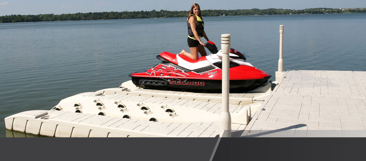 Wave Port SLX5 (5’ wide) and SLX6 (6‘ wide) are 12.8’ in length and constructed of thick, rugged, foam-filled polyethylene. These unsinkable ports utilize a proprietary foaming process which increases buoyancy and structural integrity. Molded mounting pockets in all four corners allow for numerous anchoring possibilities. Both ports accommodate any size personal watercraft and include a removable bow stop with tie-down ring and adjustable, polyurethane-overlaid wheels which can be strategically placed in the port bed to evenly distribute weight and aid in the loading/unloading process. Both models come in a Pebble Beach textured finish designed to match the Wave Dock system.